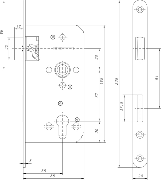 - Zamek przeciwpożarowy, wpuszczany 72/55 mm
