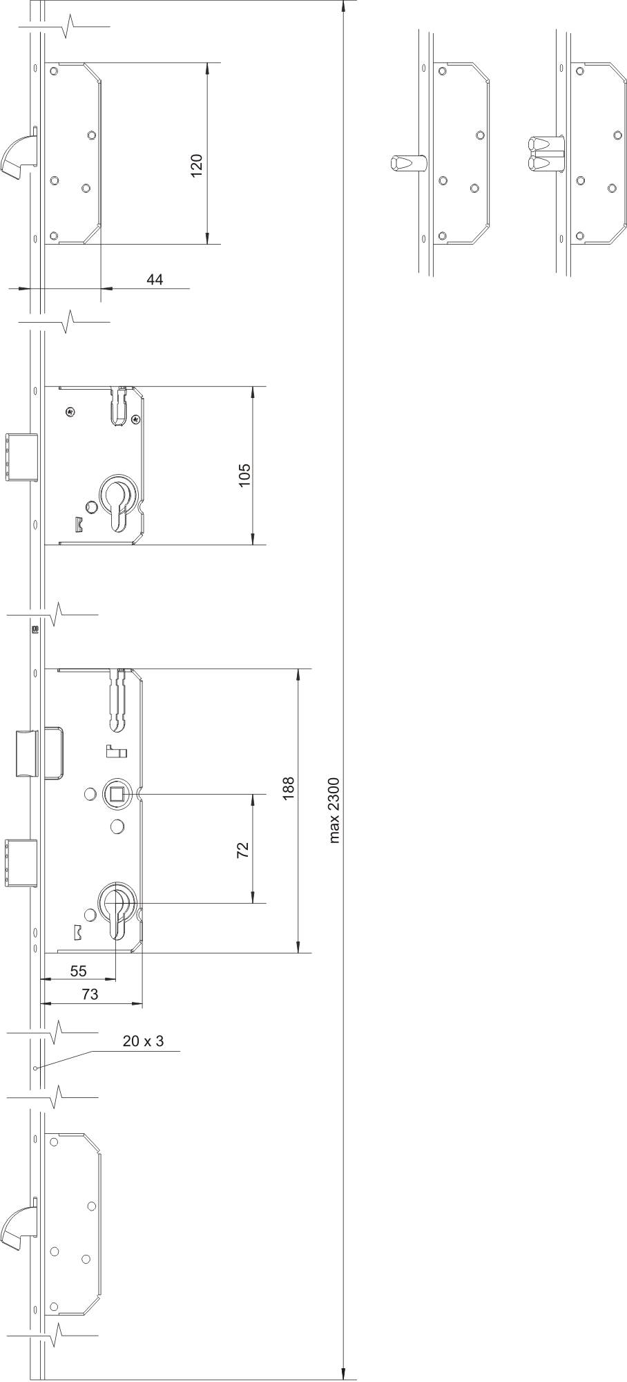 - Zamek główny 72/55 na wkładkę bębenkową.